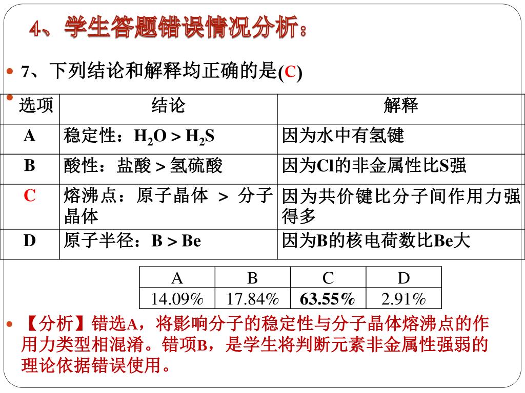 4、学生答题错误情况分析: • 7、下列结论和解释均正确的是(C) • 【分析】错选A,将影响分子的稳定性与分子晶体熔沸点的作用力类型相混淆。错项B,是学生将判断元素非金属性强弱的理论依据错误使用。
