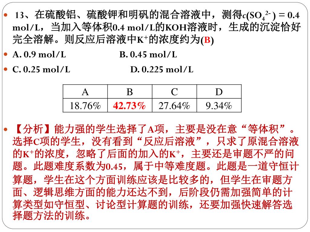 13、在硫酸铝、硫酸钾和明矾的混合溶液中,测得c(SO42- ) = 0.4 mol/L,当加入等体积0.4 mol/L的KOH溶液时,生成的沉淀恰好完全溶解。则反应后溶液中K+的浓度约为(B) • A. 0.9 mol/L B. 0.45 mol/L • C. 0.25 mol/LD. 0.225 mol/L • 【分析】能力强的学生选择了A项,主要是没在意“等体积”。选择C项的学生,没有看到“反应后溶液”,只求了原混合溶液的K+的浓度,忽略了后面的加入的K+,主要还是审题不严的问题。此题难度系数为0.45,属于中等难度题。此题是一道守恒计算题,学生在这个方面训练应该是比较多的,但学生在审题方面、逻辑思维方面的能力还达不到,后阶段仍需加强简单的计算类型如守恒型、讨论型计算题的训练,还要加强快速解答选择题方法的训练。