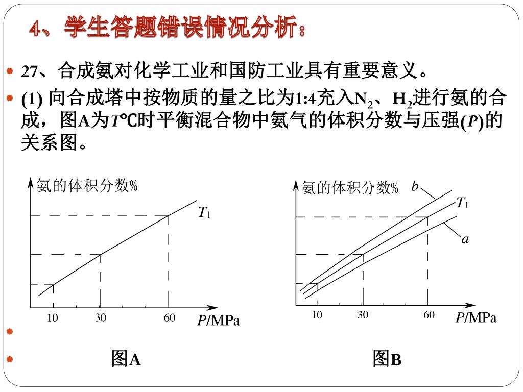 4、学生答题错误情况分析: • 27、合成氨对化学工业和国防工业具有重要意义。 • (1) 向合成塔中按物质的量之比为1:4充入N2、H2进行氨的合成,图A为T℃时平衡混合物中氨气的体积分数与压强(P)的关系图。 • 图A 图B