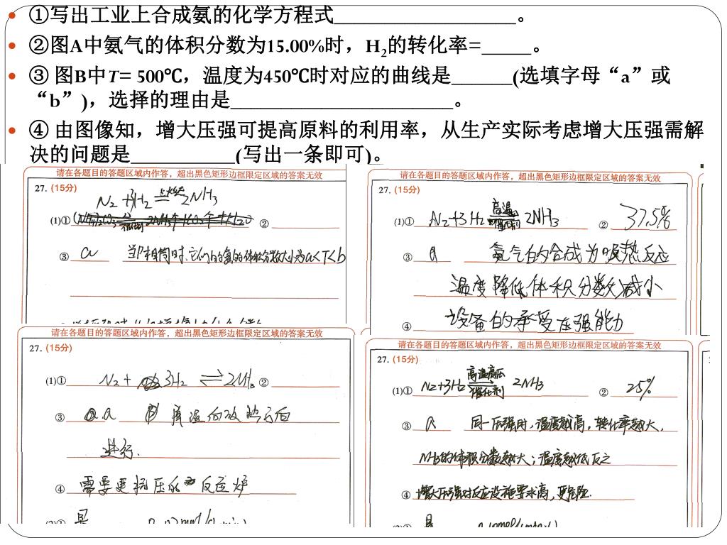 ①写出工业上合成氨的化学方程式__________________。①写出工业上合成氨的化学方程式__________________。 • ②图A中氨气的体积分数为15.00%时,H2的转化率=。 • ③ 图B中T= 500℃,温度为450℃时对应的曲线是______(选填字母“a”或“b”),选择的理由是______________________。 • ④ 由图像知,增大压强可提高原料的利用率,从生产实际考虑增大压强需解决的问题是(写出一条即可)。 • 【分析】 • (1)第一空,主要错误是学生漏掉或错写条件,如写成点燃,少数学生将“ ”写成“=”。第二空,空着的多,估计是不会做;填写了的,答案千奇百怪;有写分数的45/184,给评卷工作带来麻烦,有写25%的,没有关注到有效数字问题。第三空,有填写“a”的,估计是忘记了合成氨工业是放热反应。第四空在回答理由时表达不清,叙述不全,没有抓到本质。第五空,是开放型的,答案多种多样,多数回答都扣着“耐压、安全、成本”等词。