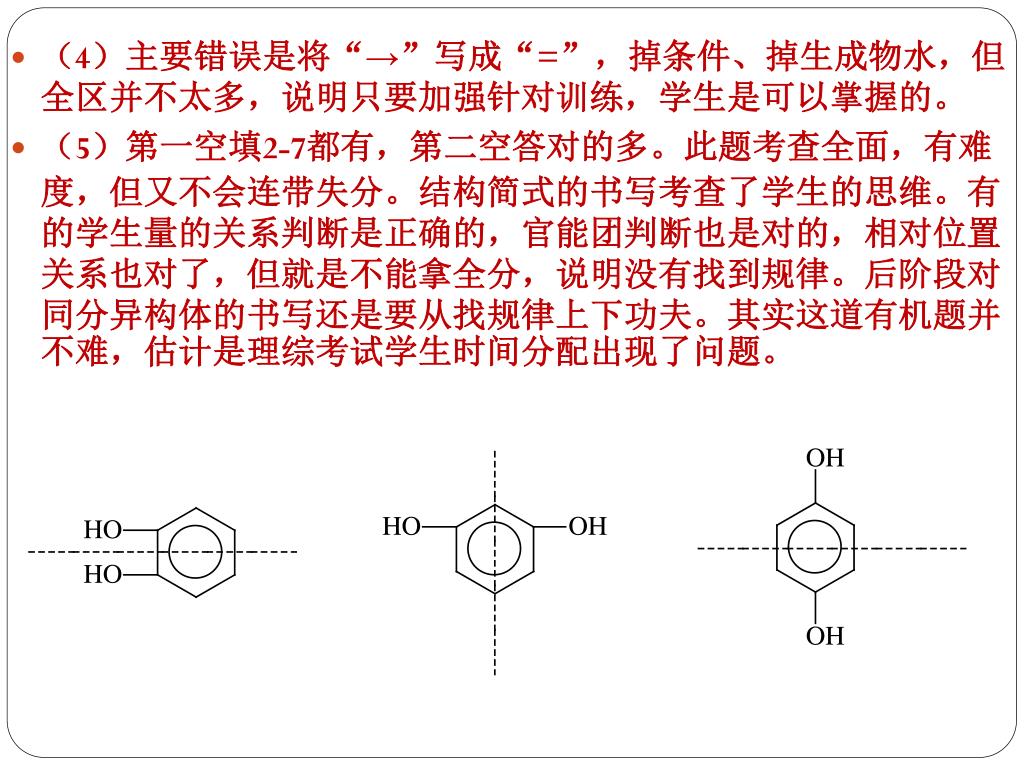 (4)主要错误是将“→”写成“=”,掉条件、掉生成物水,但全区并不太多,说明只要加强针对训练,学生是可以掌握的。(4)主要错误是将“→”写成“=”,掉条件、掉生成物水,但全区并不太多,说明只要加强针对训练,学生是可以掌握的。 • (5)第一空填2-7都有,第二空答对的多。此题考查全面,有难度,但又不会连带失分。结构简式的书写考查了学生的思维。有的学生量的关系判断是正确的,官能团判断也是对的,相对位置关系也对了,但就是不能拿全分,说明没有找到规律。后阶段对同分异构体的书写还是要从找规律上下功夫。其实这道有机题并不难,估计是理综考试学生时间分配出现了问题。