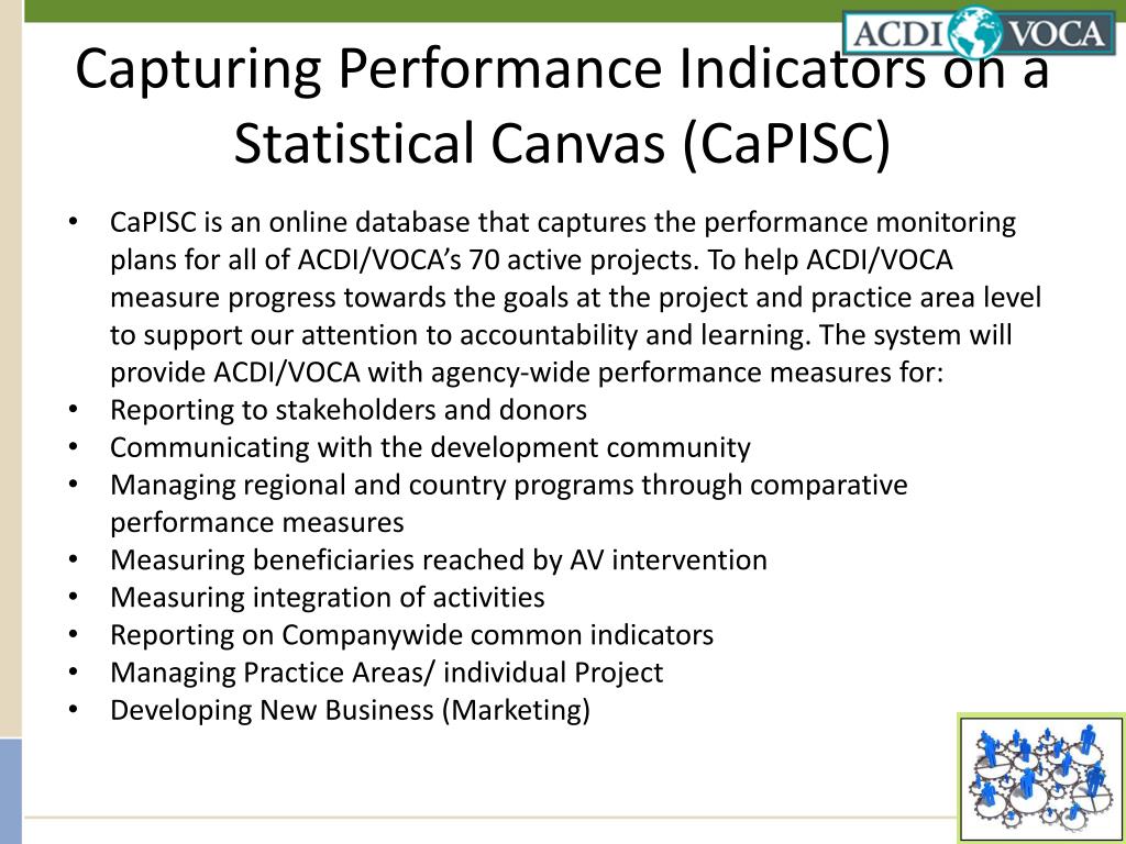 Capturing Performance Indicators on a Statistical Canvas (CaPISC) • CaPISC is an online database that captures the performance monitoring plans for all of ACDI/VOCA’s 70 active projects. To help ACDI/VOCA measure progress towards the goals at the project and practice area level to support our attention to accountability and learning. The system will provide ACDI/VOCA with agency-wide performance measures for: • Reporting to stakeholders and donors • Communicating with the development community • Managing regional and country programs through comparative performance measures • Measuring beneficiaries reached by AV intervention • Measuring integration of activities • Reporting on Companywide common indicators • Managing Practice Areas/ individual Project • Developing New Business (Marketing)