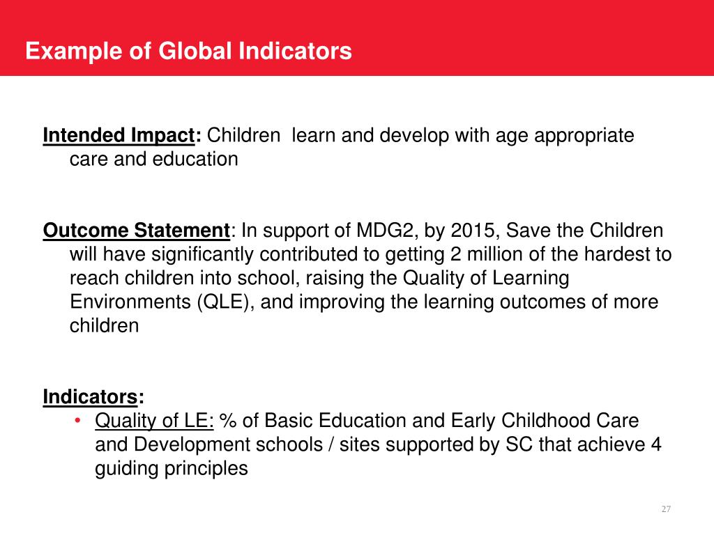 Example of Global Indicators • Intended Impact: Children learn and develop with age appropriate care and education • Outcome Statement: In support of MDG2, by 2015, Save the Children will have significantly contributed to getting 2 million of the hardest to reach children into school, raising the Quality of Learning Environments (QLE), and improving the learning outcomes of more children • Indicators: • Quality of LE: % of Basic Education and Early Childhood Care and Development schools / sites supported by SC that achieve 4 guiding principles
