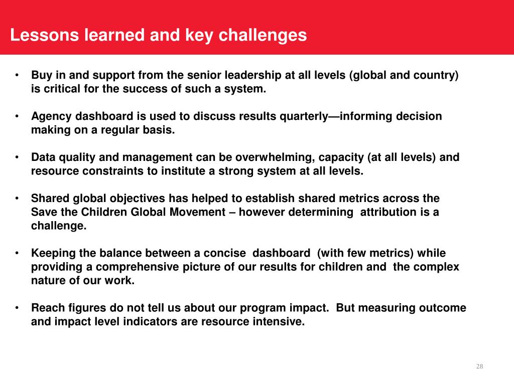 Buy in and support from the senior leadership at all levels (global and country) is critical for the success of such a system. Agency dashboard is used to discuss results quarterly—informing decision making on a regular basis. Data quality and management can be overwhelming, capacity (at all levels) and resource constraints to institute a strong system at all levels. Shared global objectives has helped to establish shared metrics across the Save the Children Global Movement – however determining attribution is a challenge. Keeping the balance between a concise dashboard (with few metrics) while providing a comprehensive picture of our results for children and the complex nature of our work. Reach figures do not tell us about our program impact. But measuring outcome and impact level indicators are resource intensive. Lessons learned and key challenges