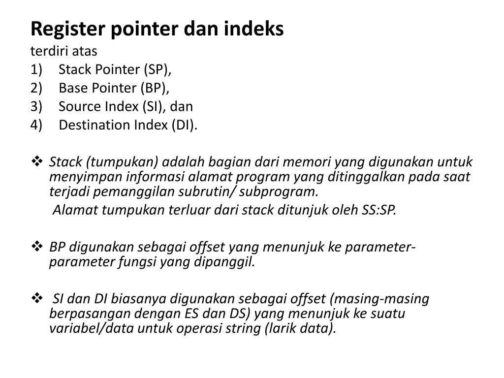 Register pointer danindeks terdiriatas • Stack Pointer (SP), • Base Pointer (BP), • Source Index (SI), dan • Destination Index (DI). • Stack (tumpukan) adalahbagiandarimemori yang digunakanuntukmenyimpaninformasialamat program yang ditinggalkanpadasaatterjadipemanggilansubrutin/ subprogram. Alamattumpukanterluardari stack ditunjukoleh SS:SP. • BP digunakansebagai offset yang menunjukke parameter-parameter fungsi yang dipanggil. • SI dan DI biasanyadigunakansebagai offset (masing-masingberpasangandengan ES dan DS) yang menunjukkesuatuvariabel/data untukoperasi string (larik data).