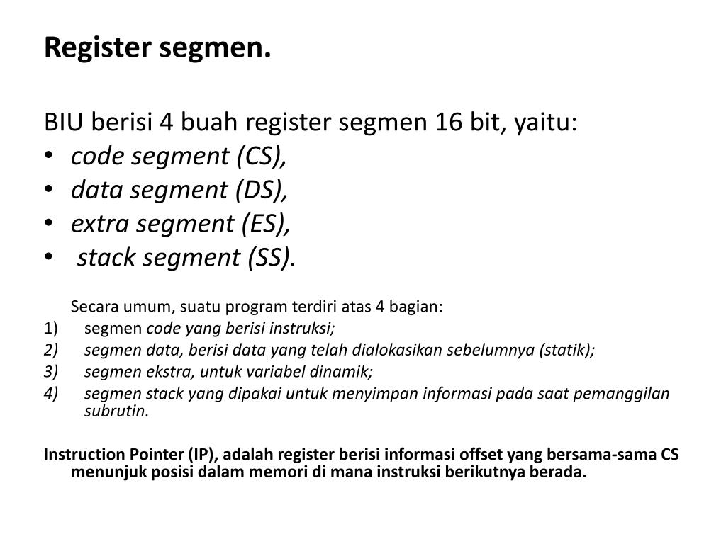 Register segmen. BIU berisi 4 buah register segmen 16 bit, yaitu: • code segment (CS), • data segment (DS), • extra segment (ES), • stack segment (SS). Secaraumum, suatu program terdiriatas 4 bagian: • segmencode yang berisiinstruksi; • segmen data, berisi data yang telahdialokasikansebelumnya (statik); • segmenekstra, untukvariabeldinamik; • segmen stack yang dipakaiuntukmenyimpaninformasipadasaatpemanggilansubrutin. Instruction Pointer (IP), adalah register berisiinformasi offset yang bersama-sama CS menunjukposisidalammemoridimanainstruksiberikutnyaberada.