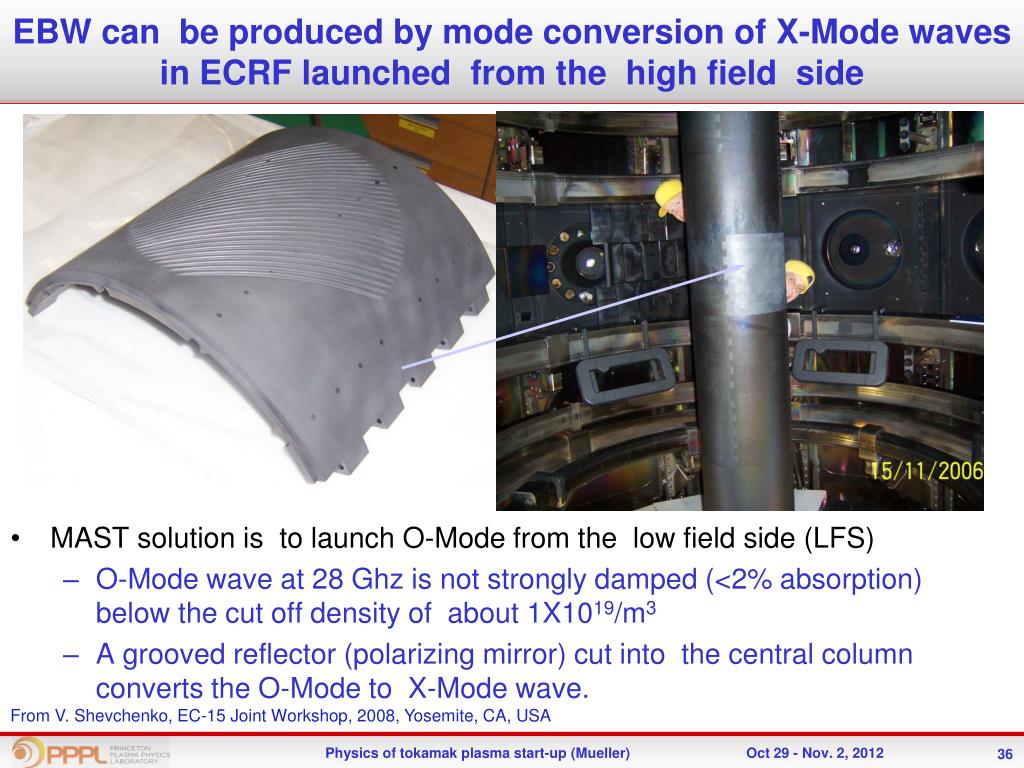 EBW can be produced by mode conversion of X-Mode waves in ECRF launched from the high field side From V. Shevchenko, EC-15 Joint Workshop, 2008, Yosemite, CA, USA MAST solution is to launch O-Mode from the low field side (LFS) • O-Mode wave at 28 Ghz is not strongly damped (<2% absorption) below the cut off density of about 1X1019/m3 • A grooved reflector (polarizing mirror) cut into the central column converts the O-Mode to X-Mode wave.