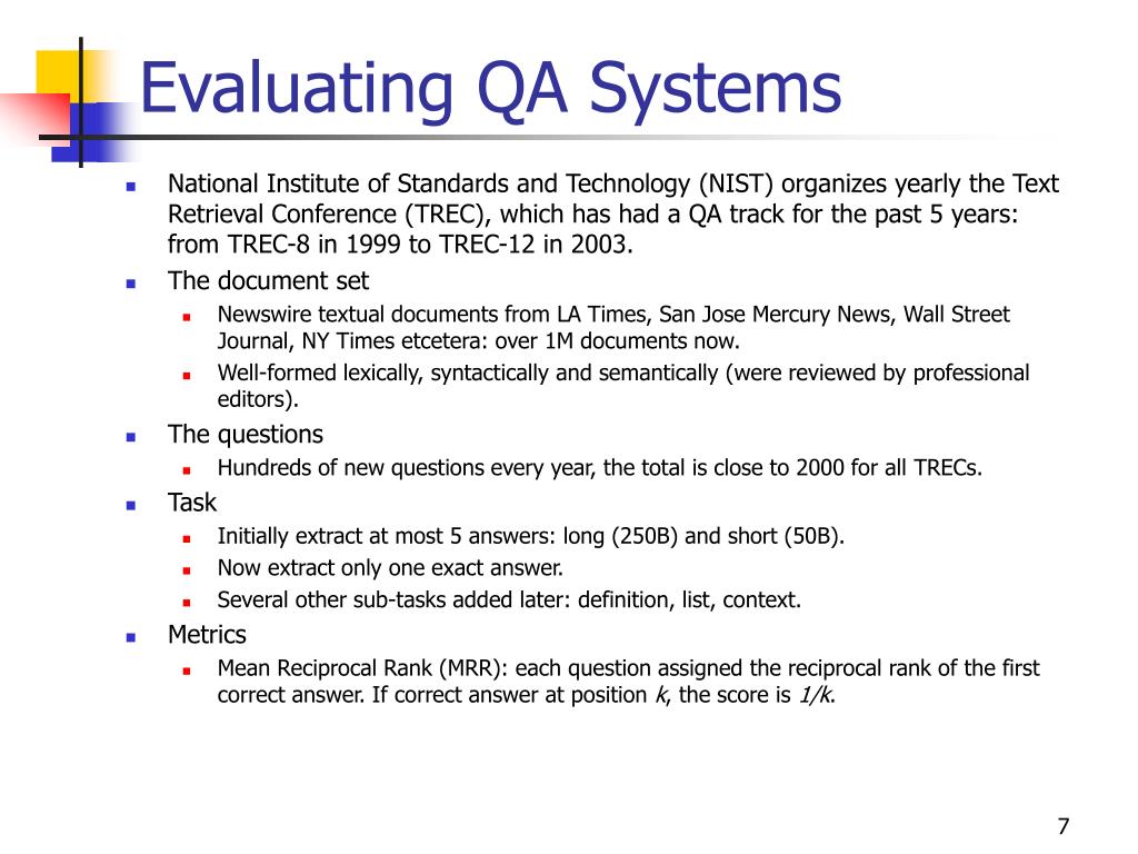 Evaluating QA Systems • National Institute of Standards and Technology (NIST) organizes yearly the Text Retrieval Conference (TREC), which has had a QA track for the past 5 years: from TREC-8 in 1999 to TREC-12 in 2003. • The document set • Newswire textual documents from LA Times, San Jose Mercury News, Wall Street Journal, NY Times etcetera: over 1M documents now. • Well-formed lexically, syntactically and semantically (were reviewed by professional editors). • The questions • Hundreds of new questions every year, the total is close to 2000 for all TRECs. • Task • Initially extract at most 5 answers: long (250B) and short (50B). • Now extract only one exact answer. • Several other sub-tasks added later: definition, list, context. • Metrics • Mean Reciprocal Rank (MRR): each question assigned the reciprocal rank of the first correct answer. If correct answer at position k, the score is 1/k.