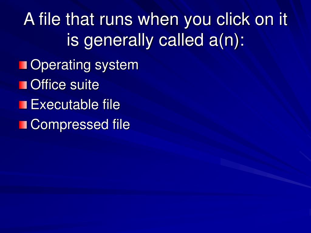 A file that runs when you click on it is generally called a(n): • Operating system • Office suite • Executable file • Compressed file