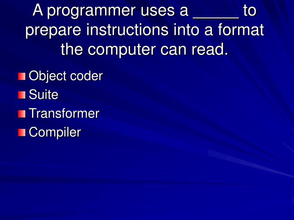 A programmer uses a _____ to prepare instructions into a format the computer can read. • Object coder • Suite • Transformer • Compiler