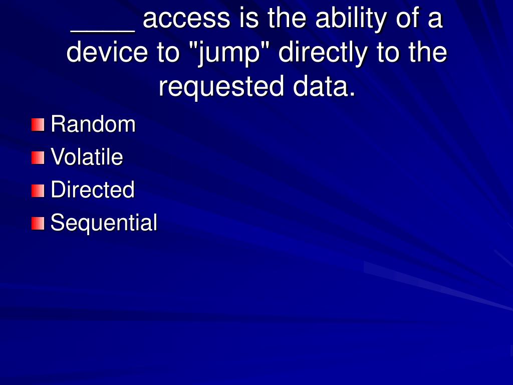 ____ access is the ability of a device to "jump" directly to the requested data. • Random • Volatile • Directed • Sequential