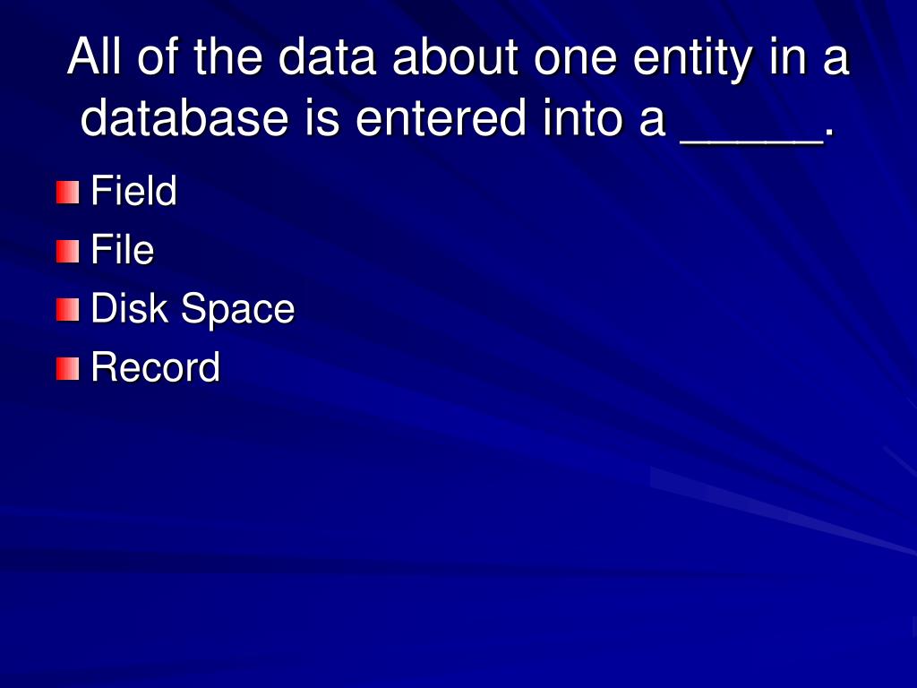 All of the data about one entity in a database is entered into a _____. • Field • File • Disk Space • Record