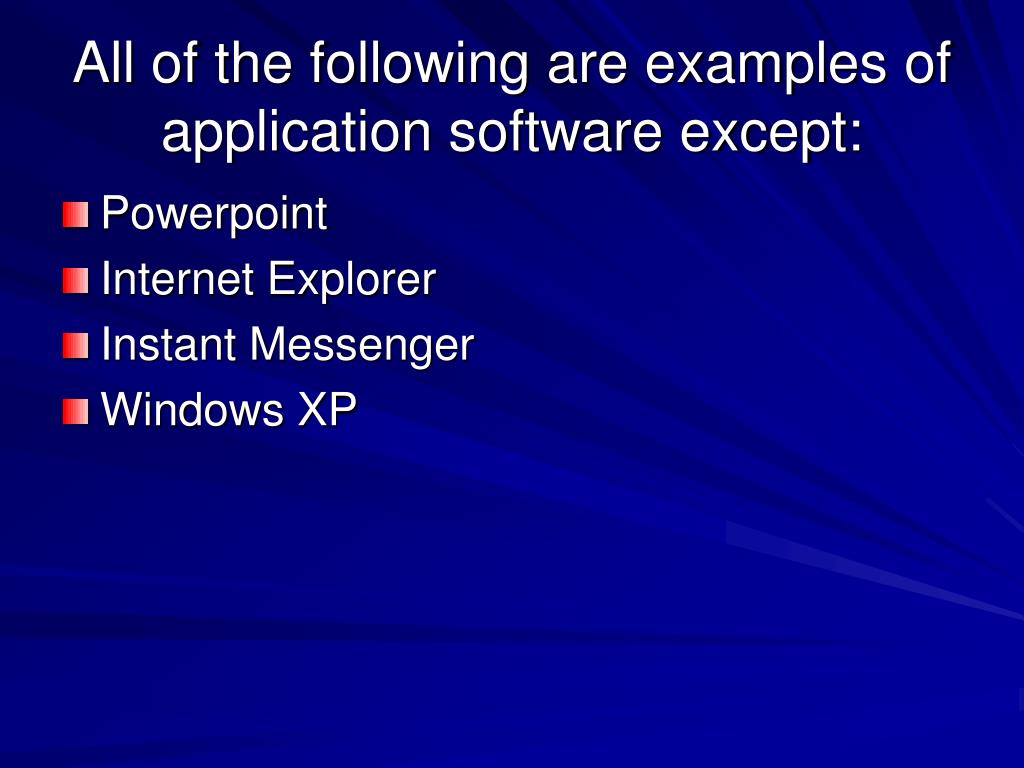 All of the following are examples of application software except: • Powerpoint • Internet Explorer • Instant Messenger • Windows XP