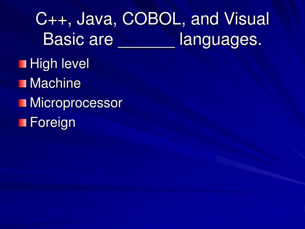 C++, Java, COBOL, and Visual Basic are ______ languages. • High level • Machine • Microprocessor • Foreign