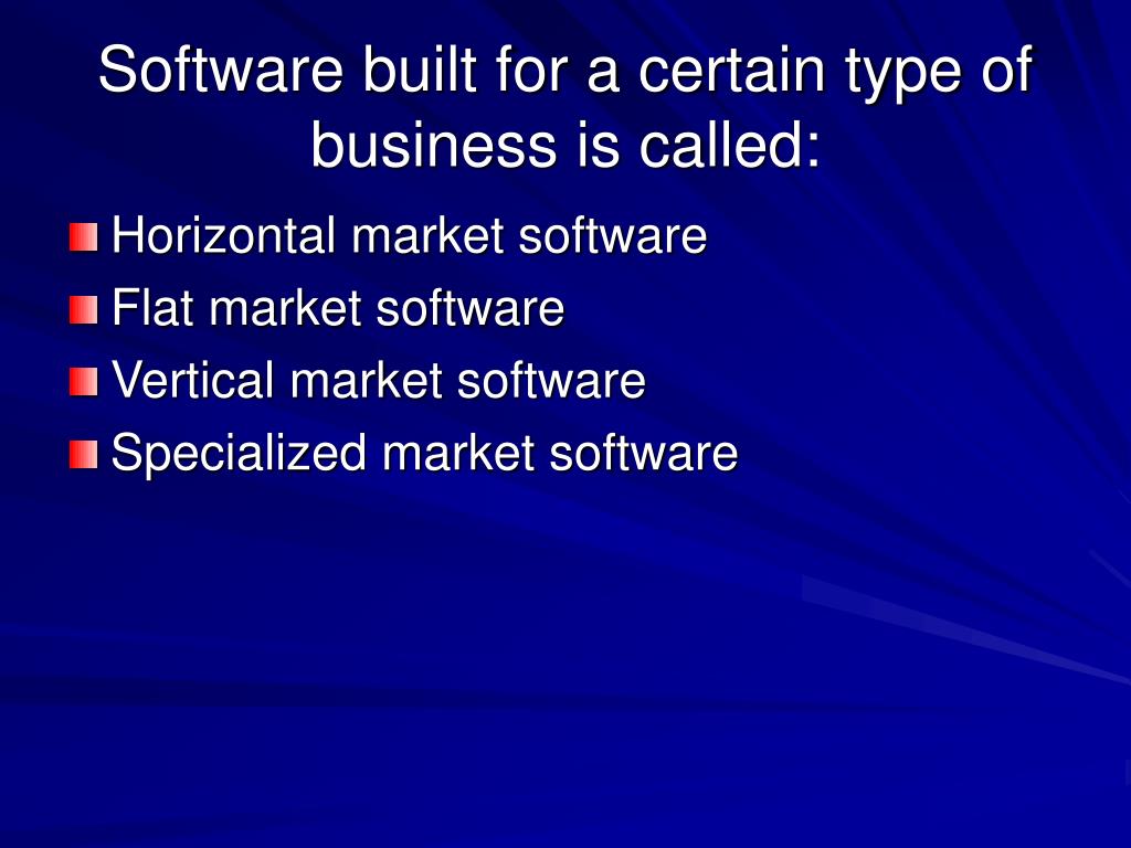 Software built for a certain type of business is called: • Horizontal market software • Flat market software • Vertical market software • Specialized market software