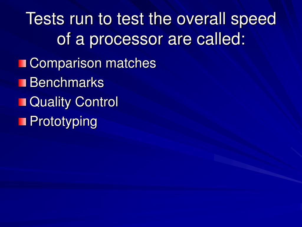 Tests run to test the overall speed of a processor are called: • Comparison matches • Benchmarks • Quality Control • Prototyping