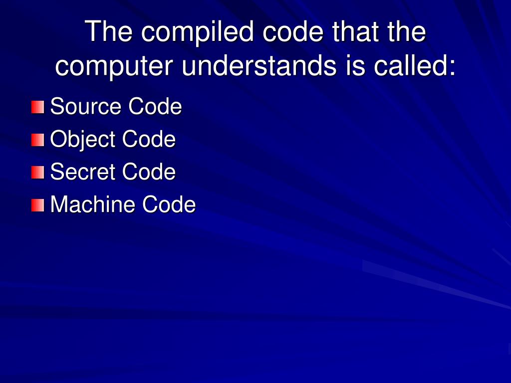 The compiled code that the computer understands is called: • Source Code • Object Code • Secret Code • Machine Code