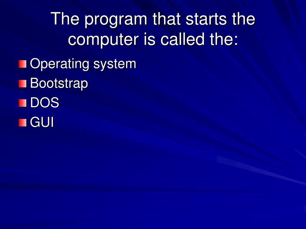 The program that starts the computer is called the: • Operating system • Bootstrap • DOS • GUI