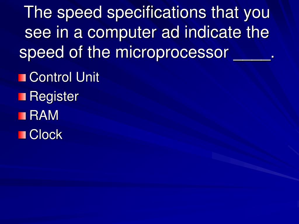 The speed specifications that you see in a computer ad indicate the speed of the microprocessor ____. • Control Unit • Register • RAM • Clock