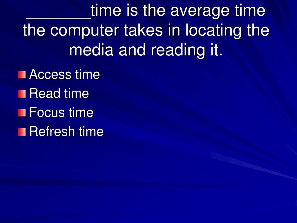 _______time is the average time the computer takes in locating the media and reading it. • Access time • Read time • Focus time • Refresh time