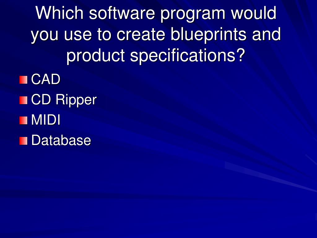 Which software program would you use to create blueprints and product specifications? • CAD • CD Ripper • MIDI • Database