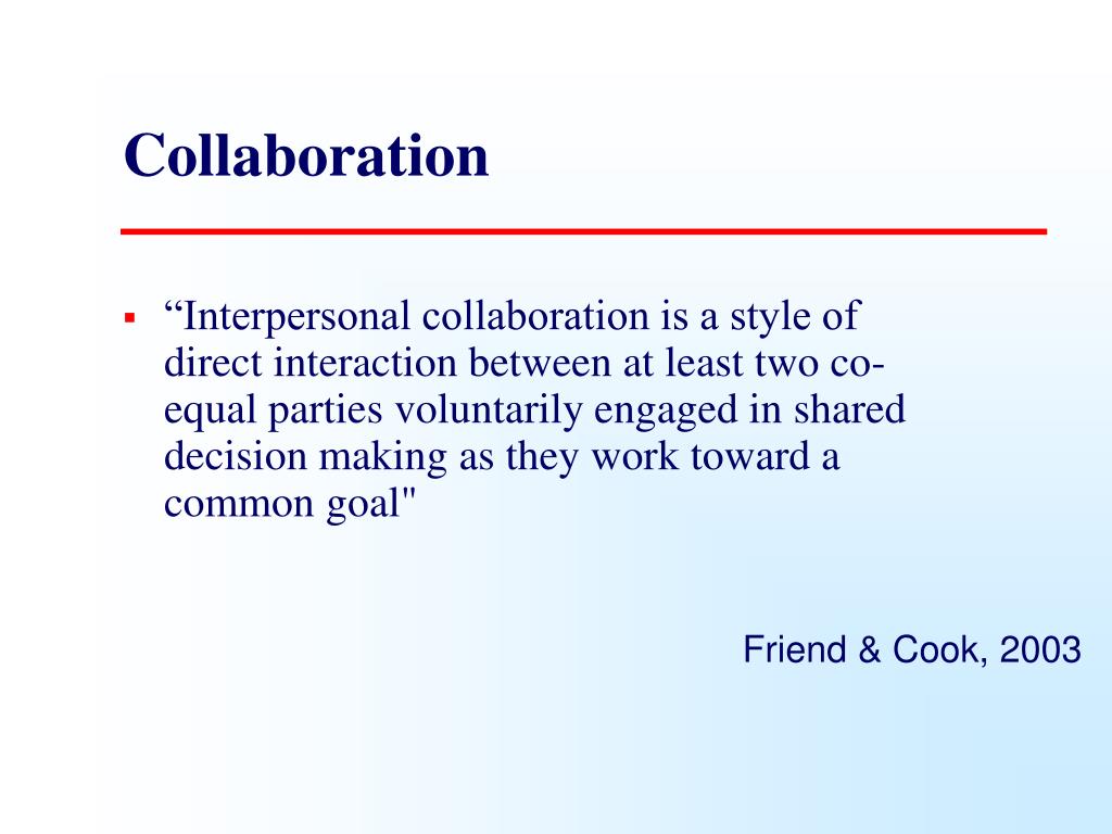Collaboration • “Interpersonal collaboration is a style of direct interaction between at least two co-equal parties voluntarily engaged in shared decision making as they work toward a common goal" Friend & Cook, 2003