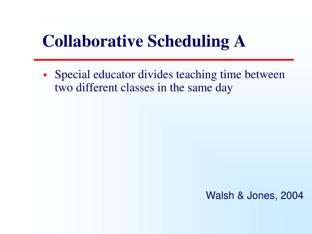 Collaborative Scheduling A • Special educator divides teaching time between two different classes in the same day Walsh & Jones, 2004