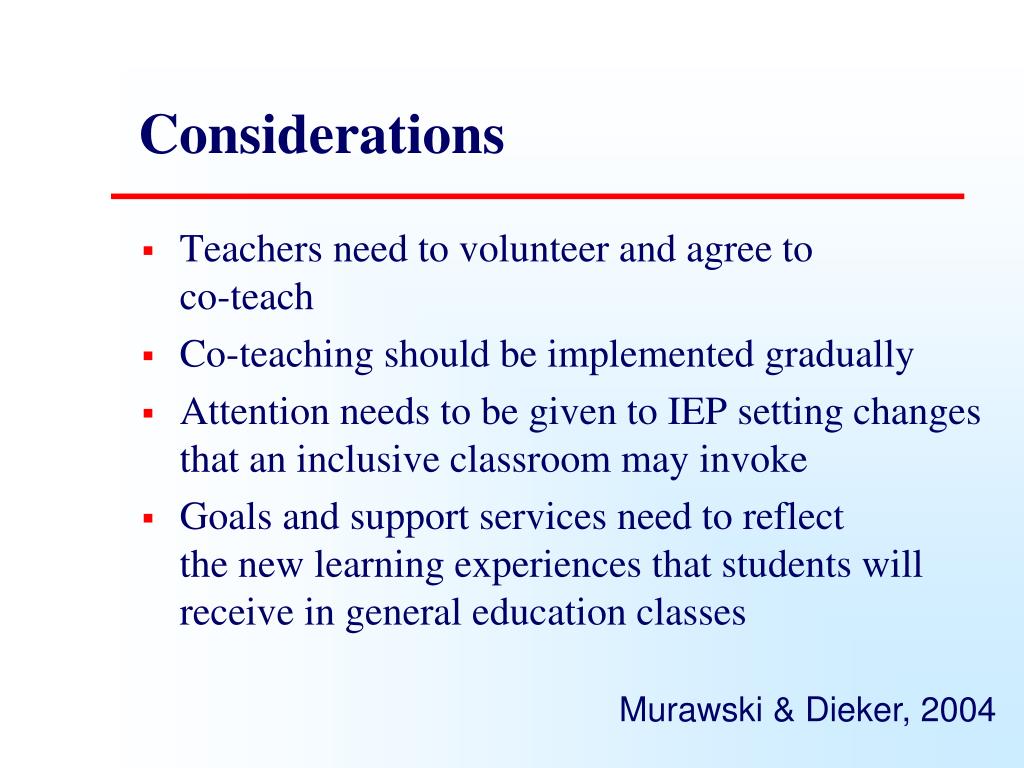 Considerations • Teachers need to volunteer and agree toco-teach • Co-teaching should be implemented gradually • Attention needs to be given to IEP setting changes that an inclusive classroom may invoke • Goals and support services need to reflectthe new learning experiences that students will receive in general education classes Murawski & Dieker, 2004