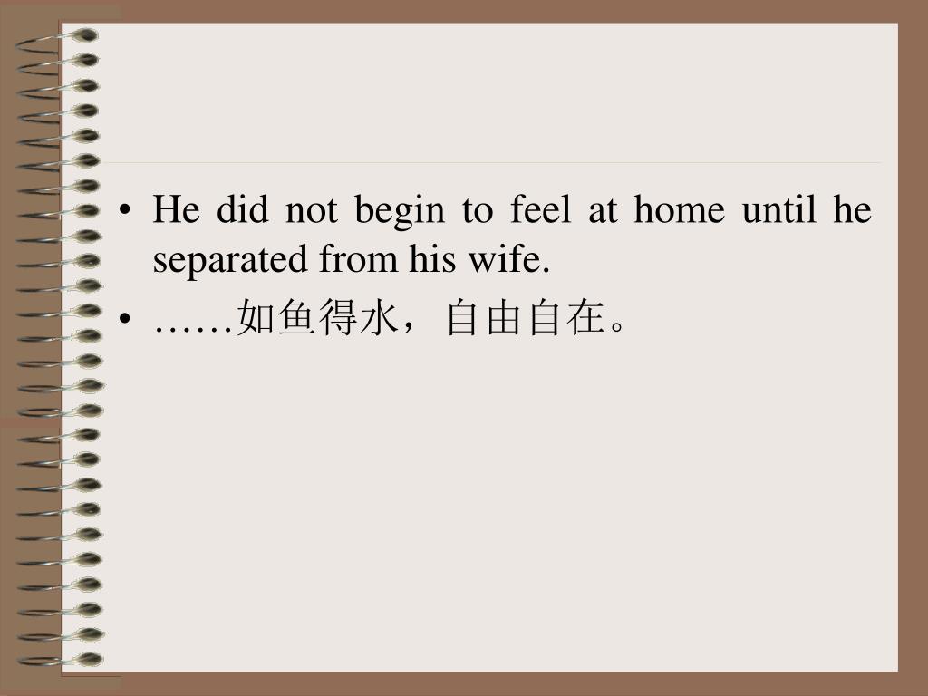 He did not begin to feel at home until he separated from his wife. • ……如鱼得水,自由自在。