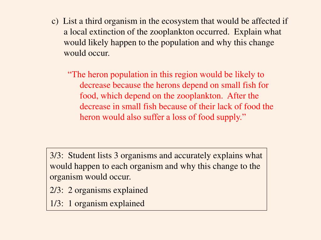 c) List a third organism in the ecosystem that would be affected if a local extinction of the zooplankton occurred. Explain what would likely happen to the population and why this change would occur. • “The heron population in this region would be likely to decrease because the herons depend on small fish for food, which depend on the zooplankton. After the decrease in small fish because of their lack of food the heron would also suffer a loss of food supply.” 3/3: Student lists 3 organisms and accurately explains what would happen to each organism and why this change to the organism would occur. 2/3: 2 organisms explained 1/3: 1 organism explained