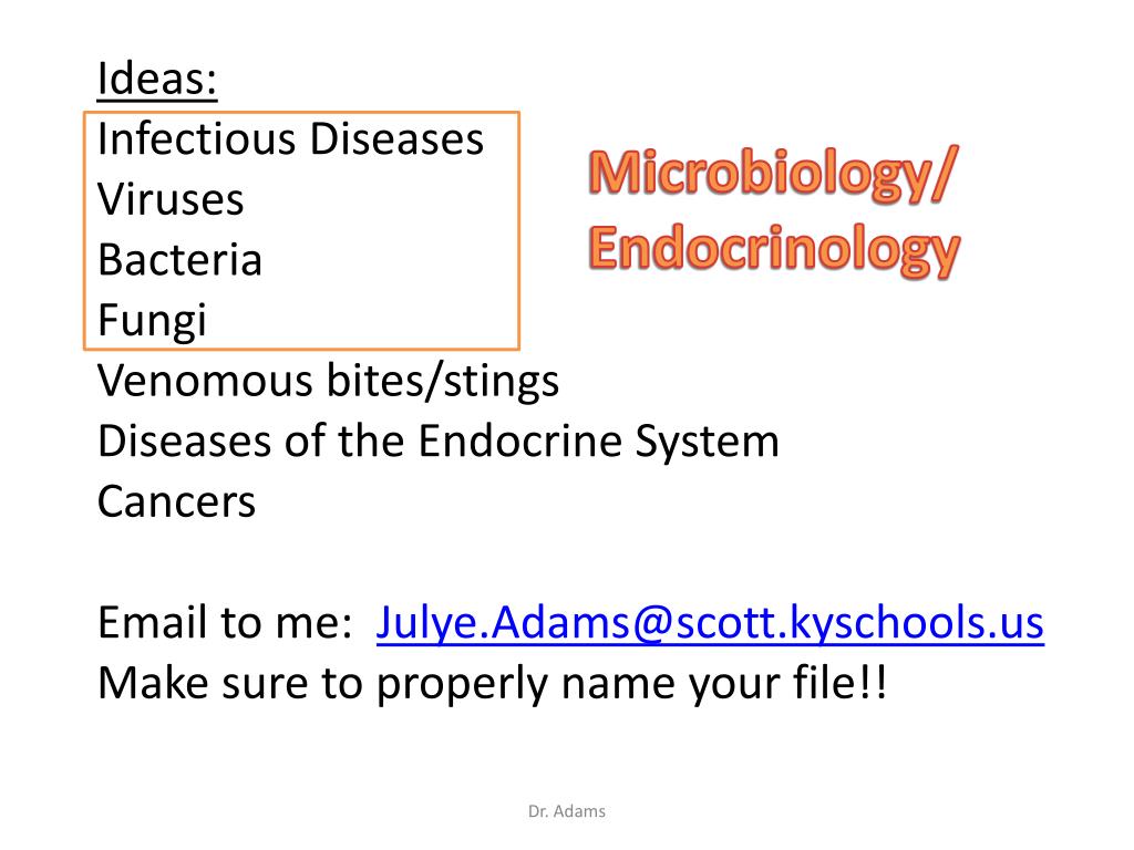 Ideas: Infectious Diseases Viruses Bacteria Fungi Venomous bites/stings Diseases of the Endocrine System Cancers Email to me: Julye.Adams@scott.kyschools.us Make sure to properly name your file!! Microbiology/ Endocrinology Dr. Adams