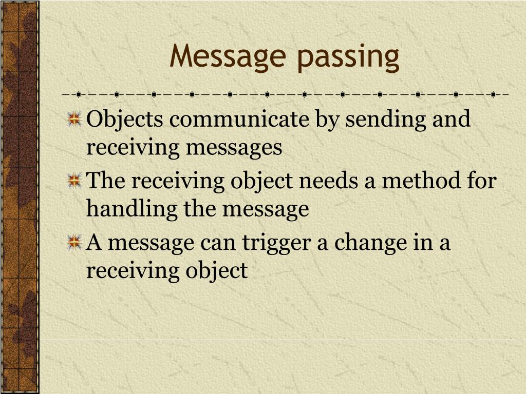 Message passing • Objects communicate by sending and receiving messages • The receiving object needs a method for handling the message • A message can trigger a change in a receiving object