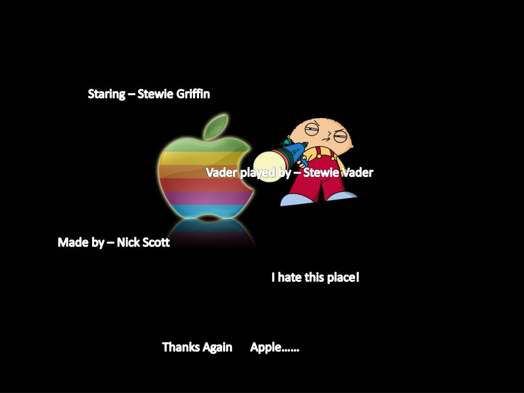 Staring – Stewie Griffin Vader played by – Stewie Vader Made by – Nick Scott I hate this place! Thanks Again Apple……