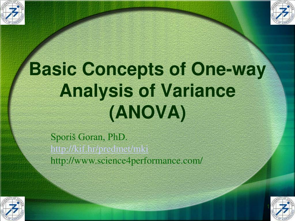 Basic Concepts of One-wayAnalysis of Variance (ANOVA) Sporiš Goran, PhD. http://kif.hr/predmet/mki http://www.science4performance.com/