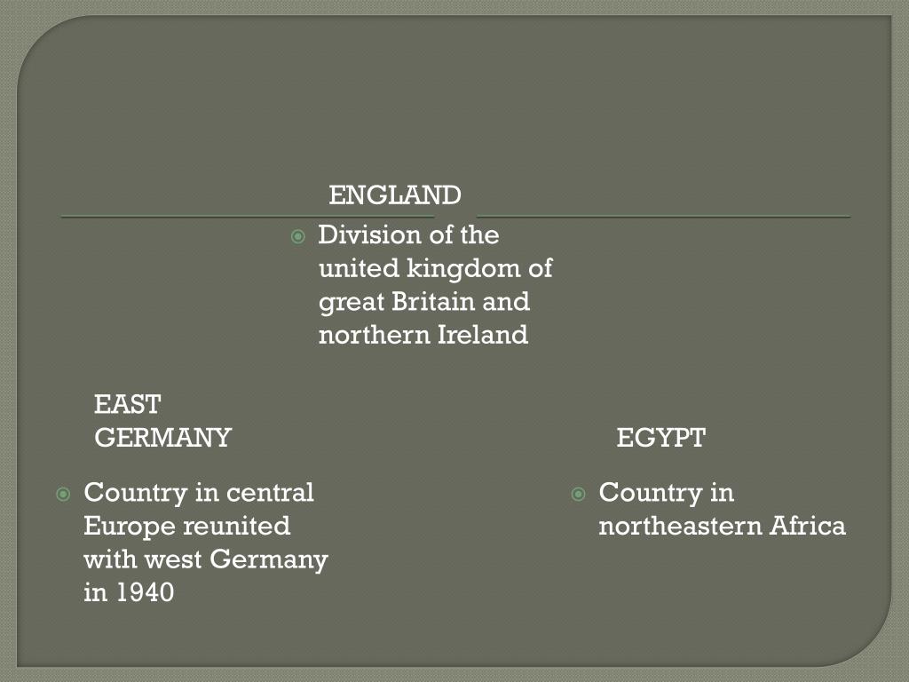 England East Germany Egypt • Division of the united kingdom of great Britain and northern Ireland • Country in central Europe reunited with west Germany in 1940 • Country in northeastern Africa
