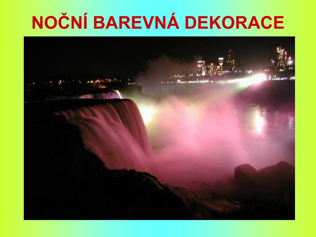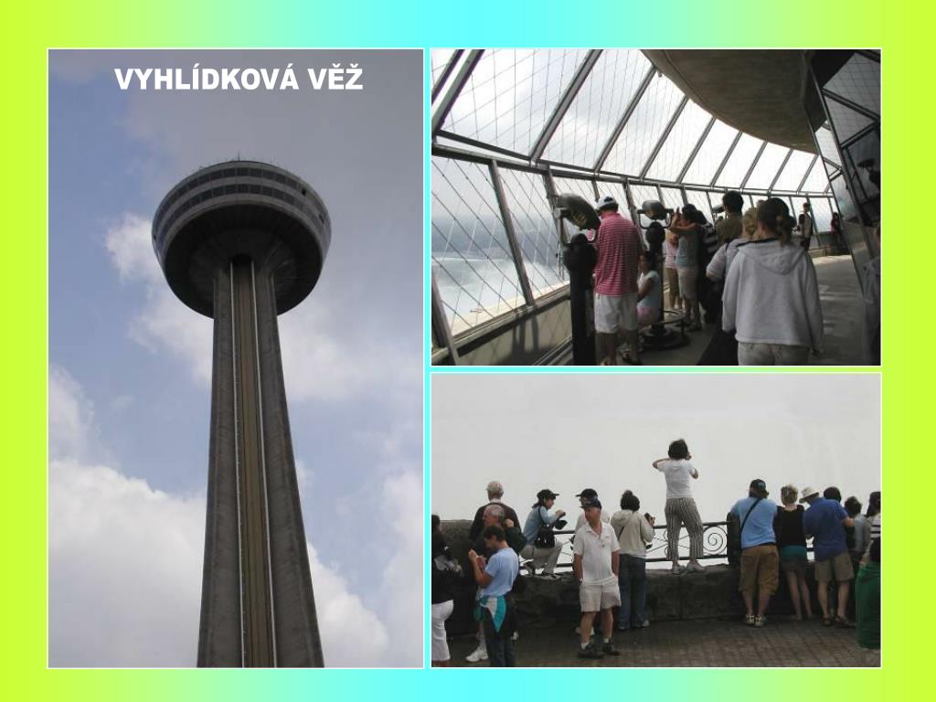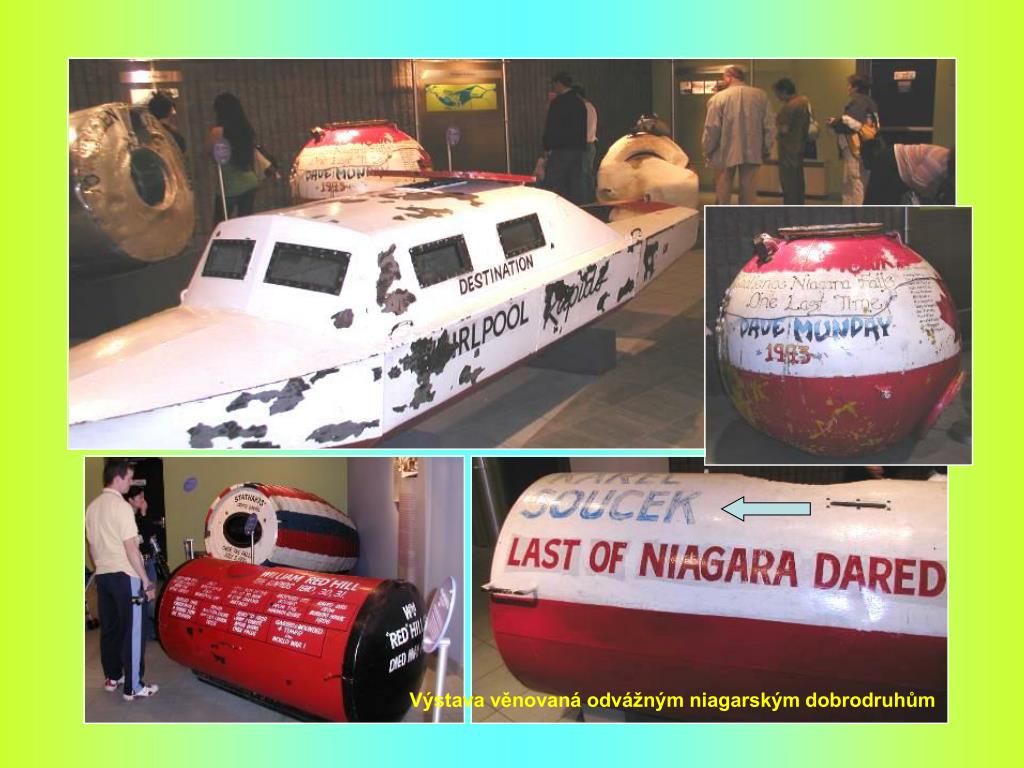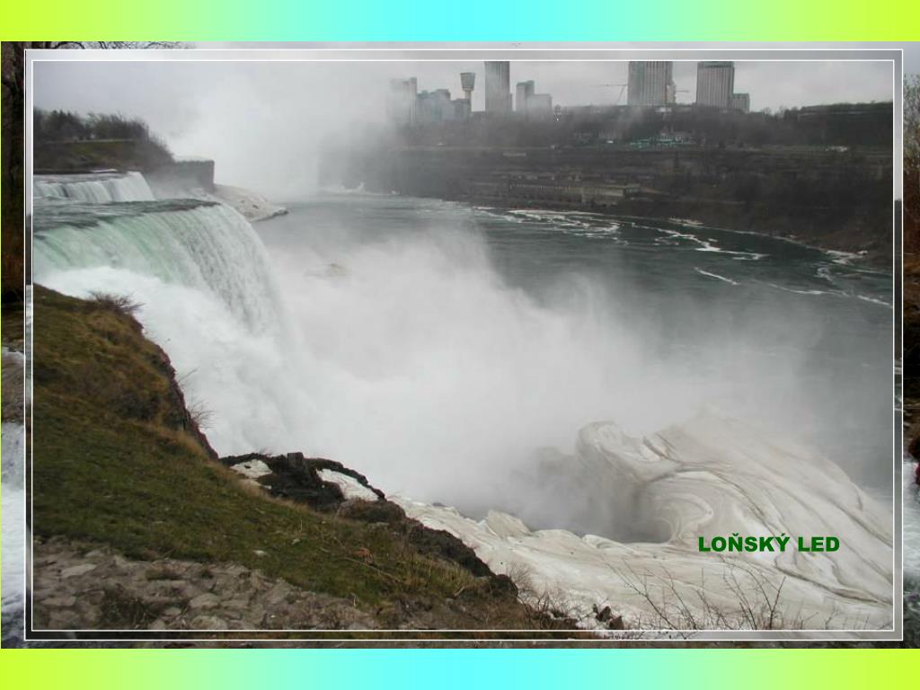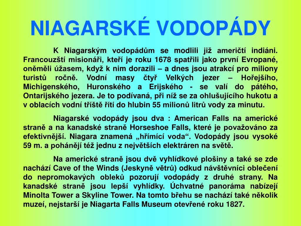 NIAGARSKÉ VODOPÁDY K Niagarským vodopádům se modlili již američtí indiáni. Francouzští misionáři, kteří je roku 1678 spatřili jako první Evropané, oněměli úžasem, když k nim dorazili – a dnes jsou atrakcí pro miliony turistů ročně. Vodní masy čtyř Velkých jezer – Hořejšího, Michigenského, Huronského a Erijského - se valí do pátého, Ontarijského jezera. Je to podívaná, při níž se za ohlušujícího hukotu a v oblacích vodní tříště řítí do hlubin 55 milionů litrů vody za minutu. Niagarské vodopády jsou dva : American Falls na americké straně a na kanadské straně Horseshoe Falls, které je považováno za efektivnější. Niagara znamená „hřímící voda“. Vodopády jsou vysoké 59 m. a pohánějí též jednu z největších elektráren na světě. Na americké straně jsou dvě vyhlídkové plošiny a také se zde nachází Cave of the Winds (Jeskyně větrů) odkud návštěvníci oblečení do nepromokavých obleků pozorují vodopády z druhé strany. Na kanadské straně jsou lepší vyhlídky. Úchvatné panoráma nabízejí Minolta Tower a Skyline Tower. Na tomto břehu se nachází také několik muzeí, nejstarší je Niagarta Falls Museum otevřené roku 1827.