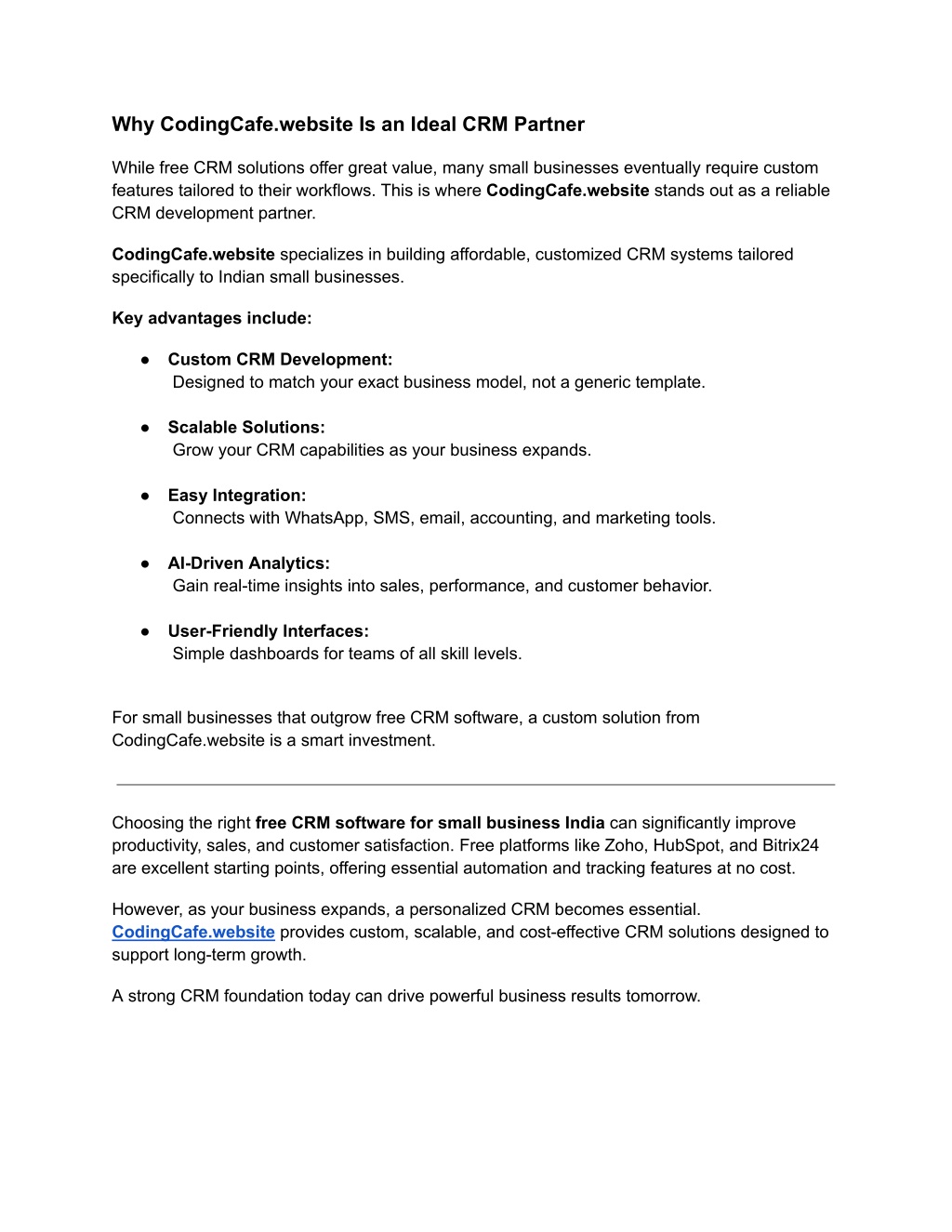 3. Why CodingCafe.website Is an Ideal CRM Partner While free CRM solutions offer great value, many small businesses eventually require custom features tailored to their workflows. This is where CodingCafe.website stands out as a reliable CRM development partner. CodingCafe.website specializes in building affordable, customized CRM systems tailored specifically to Indian small businesses. Key advantages include: ● Custom CRM Development: Designed to match your exact business model, not a generic template. ● Scalable Solutions: Grow your CRM capabilities as your business expands. ● Easy Integration: Connects with WhatsApp, SMS, email, accounting, and marketing tools. ● AI-Driven Analytics: Gain real-time insights into sales, performance, and customer behavior. ● User-Friendly Interfaces: Simple dashboards for teams of all skill levels. For small businesses that outgrow free CRM software, a custom solution from CodingCafe.website is a smart investment. Choosing the right free CRM software for small business India can significantly improve productivity, sales, and customer satisfaction. Free platforms like Zoho, HubSpot, and Bitrix24 are excellent starting points, offering essential automation and tracking features at no cost. However, as your business expands, a personalized CRM becomes essential. CodingCafe.website provides custom, scalable, and cost-effective CRM solutions designed to support long-term growth. A strong CRM foundation today can drive powerful business results tomorrow.