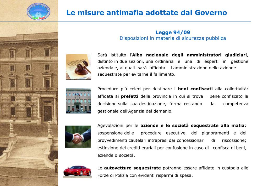 Le misure antimafia adottate dal Governo Legge 94/09 Disposizioni in materia di sicurezza pubblica Sarà istituito l’Albo nazionale degli amministratori giudiziari, distinto in due sezioni, una ordinaria e una di esperti in gestione aziendale, ai quali sarà affidata l’amministrazione delle aziende sequestrate per evitarne il fallimento. Procedure più celeri per destinare i beni confiscati alla collettività: affidata ai prefetti della provincia in cui si trova il bene confiscato la decisione sulla sua destinazione, ferma restando la competenza gestionale dell’Agenzia del demanio. • Agevolazioni per le aziende e le società sequestrate alla mafia: sospensione delle procedure esecutive, dei pignoramenti e dei provvedimenti cautelari intrapresi dai concessionari di riscossione; estinzione dei crediti erariali per confusione in caso di confisca di beni, aziende o società. • Le autovetture sequestrate potranno essere affidate in custodia alle Forze di Polizia con evidenti risparmi di spesa.