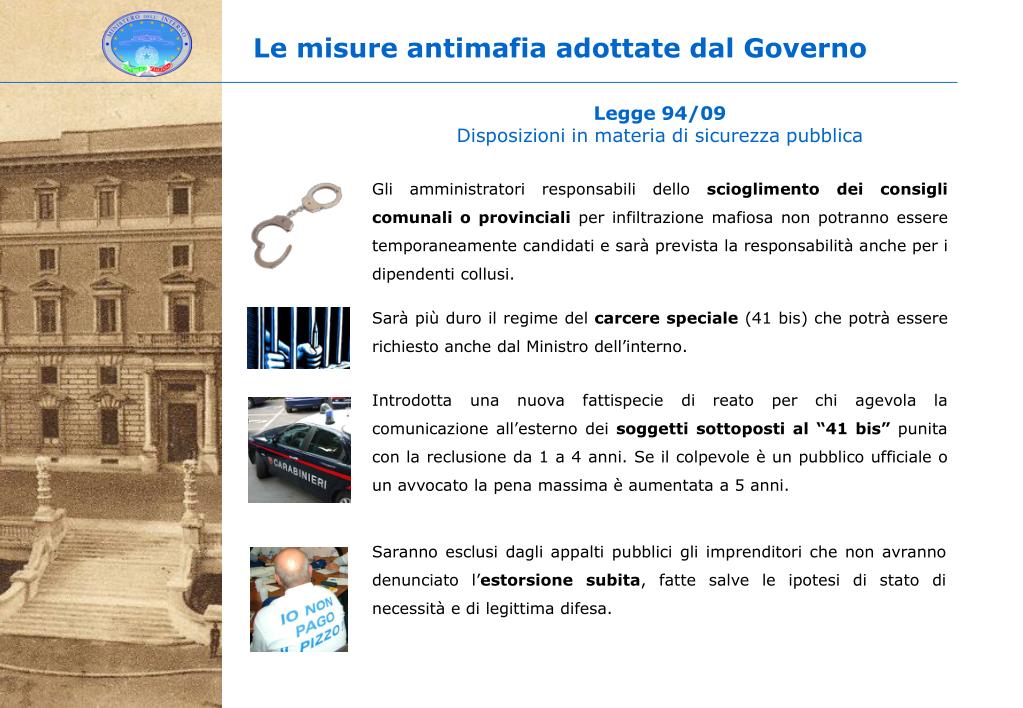 Le misure antimafia adottate dal Governo Legge 94/09 Disposizioni in materia di sicurezza pubblica Gli amministratori responsabili dello scioglimento dei consigli comunali o provinciali per infiltrazione mafiosa non potranno essere temporaneamente candidati e sarà prevista la responsabilità anche per i dipendenti collusi. Sarà più duro il regime del carcere speciale (41 bis) che potrà essere richiesto anche dal Ministro dell’interno. Introdotta una nuova fattispecie di reato per chi agevola la comunicazione all’esterno dei soggetti sottoposti al “41 bis” punita con la reclusione da 1 a 4 anni. Se il colpevole è un pubblico ufficiale o un avvocato la pena massima è aumentata a 5 anni. Saranno esclusi dagli appalti pubblici gli imprenditori che non avranno denunciatol’estorsione subita, fatte salve le ipotesi di stato di necessità e di legittima difesa.