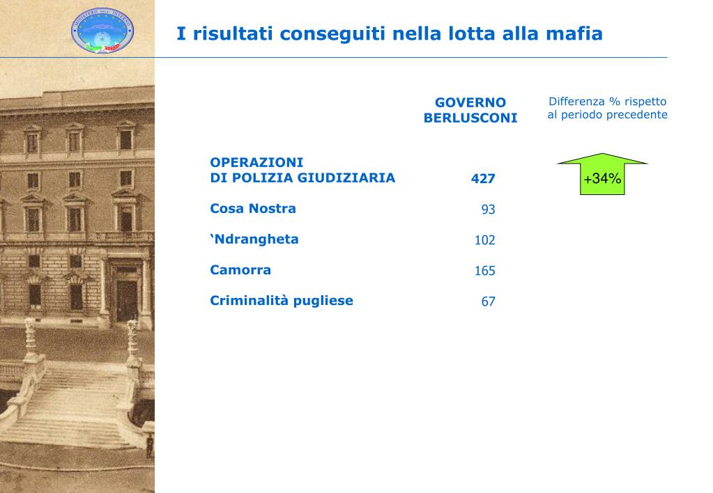 I risultati conseguiti nella lotta alla mafia GOVERNO BERLUSCONI Differenza % rispetto al periodo precedente OPERAZIONIDI POLIZIA GIUDIZIARIA Cosa Nostra ‘Ndrangheta Camorra Criminalità pugliese +34% 427 93 102 165 67
