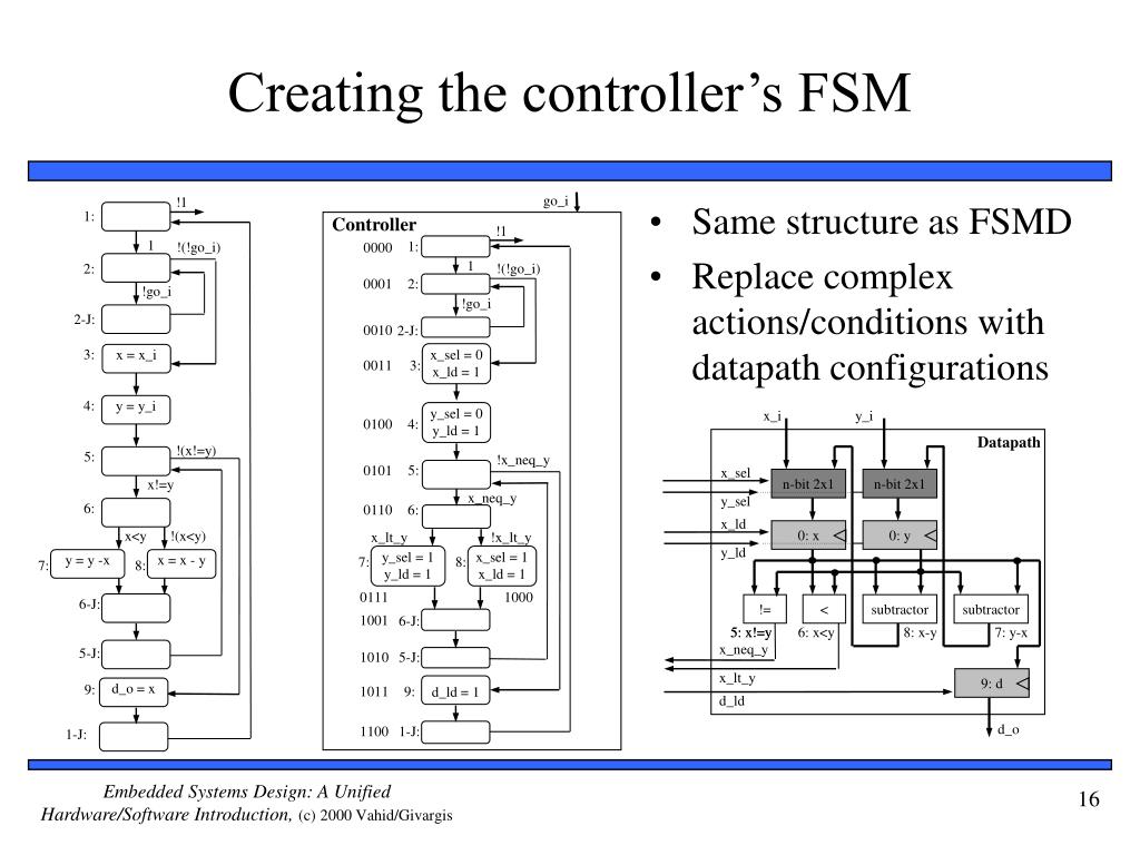 !1 1: 1 !(!go_i) 2: x_i y_i !go_i Datapath 2-J: x_sel n-bit 2x1 n-bit 2x1 3: x = x_i y_sel x_ld 0: x 0: y 4: y = y_i y_ld !(x!=y) 5: != < subtractor subtractor x!=y 5: x!=y 5: x!=y 6: x<y 8: x-y 7: y-x 6: x_neq_y x<y !(x<y) x_lt_y 9: d y = y -x x = x - y 7: 8: d_ld d_o 6-J: 5-J: d_o = x 9: 1-J: Creating the datapath • Create a register for any declared variable • Create a functional unit for each arithmetic operation • Connect the ports, registers and functional units • Based on reads and writes • Use multiplexors for multiple sources • Create unique identifier • for each datapath component control input and output