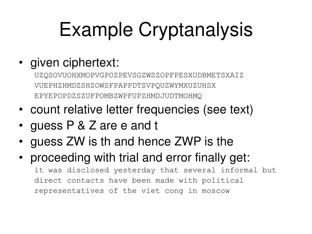 Example Cryptanalysis • given ciphertext: UZQSOVUOHXMOPVGPOZPEVSGZWSZOPFPESXUDBMETSXAIZ VUEPHZHMDZSHZOWSFPAPPDTSVPQUZWYMXUZUHSX EPYEPOPDZSZUFPOMBZWPFUPZHMDJUDTMOHMQ • count relative letter frequencies (see text) • guess P & Z are e and t • guess ZW is th and hence ZWP is the • proceeding with trial and error finally get: it was disclosed yesterday that several informal but direct contacts have been made with political representatives of the viet cong in moscow