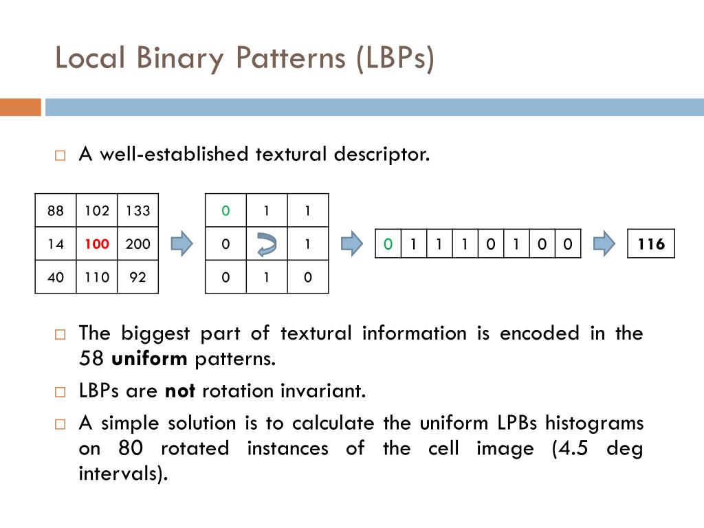 Local Binary Patterns (LBPs) • A well-established textural descriptor. • The biggest part of textural information is encoded in the 58 uniform patterns. • LBPs are not rotation invariant. • A simple solution is to calculate the uniform LPBs histograms on 80 rotated instances of the cell image (4.5 deg intervals).