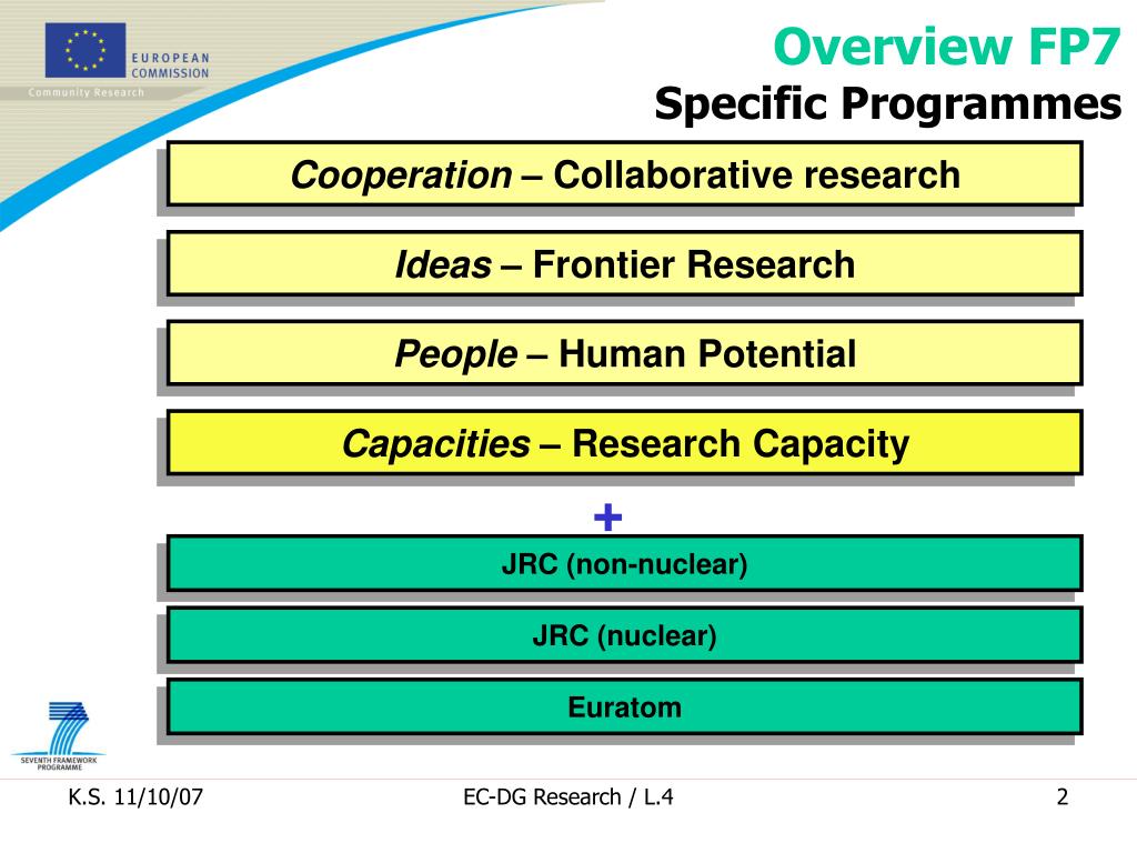 Overview FP7Specific Programmes Cooperation – Collaborative research Ideas – Frontier Research People – Human Potential Capacities – Research Capacity + JRC (non-nuclear) JRC (nuclear) Euratom EC-DG Research / L.4