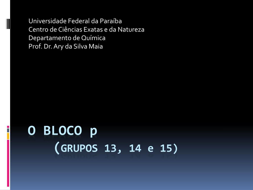 Universidade Federal da Paraíba Centro de Ciências Exatas e da Natureza Departamento de Química Prof. Dr. Ary da Silva Maia. O BLOCO p ( GRUPOS 13, 14 e 15). O BLOCO p - INTRODUÇÃO. Trata-se da seção da Tabela Periódica onde ocorre a maior variação das propriedades químicas dos elementos.