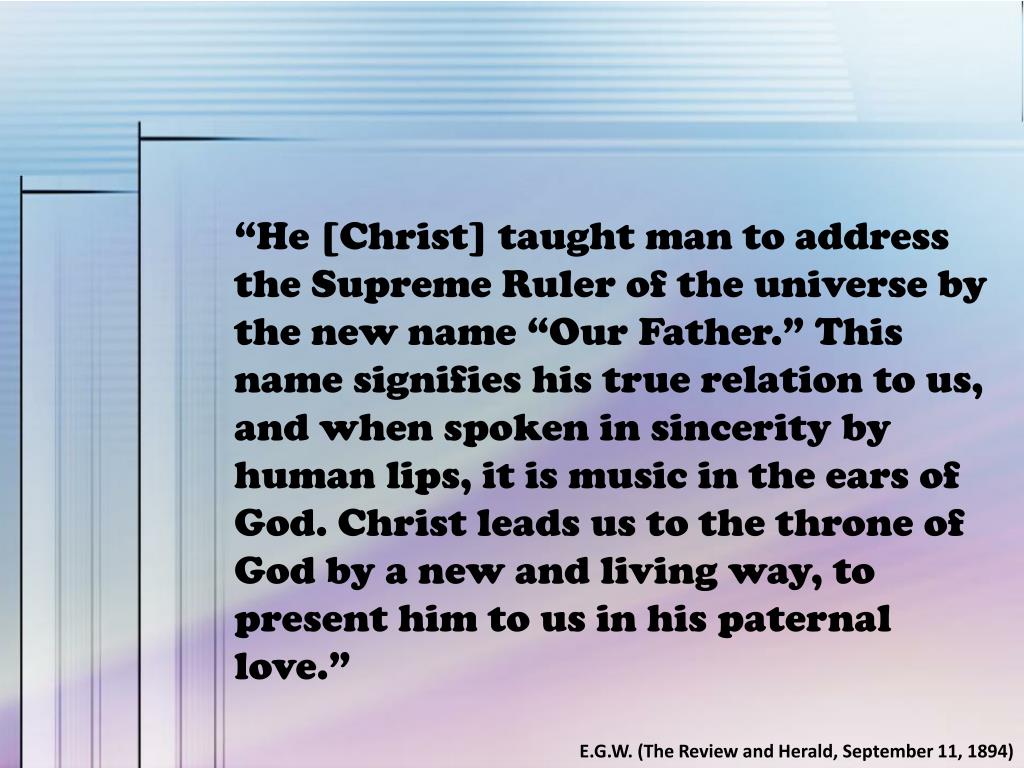 “He [Christ] taught man to address the Supreme Ruler of the universe by the new name “Our Father.” This name signifies his true relation to us, and when spoken in sincerity by human lips, it is music in the ears of God. Christ leads us to the throne of God by a new and living way, to present him to us in his paternal love.” E.G.W. (The Review and Herald, September 11, 1894)