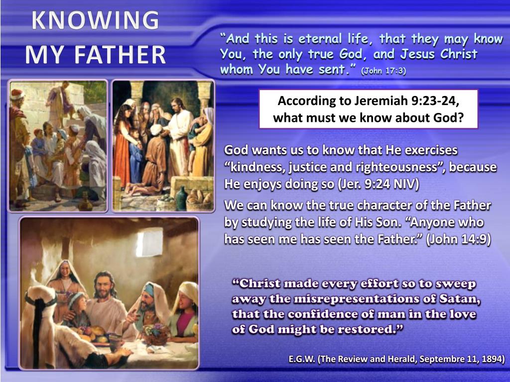 KNOWING MY FATHER “And this is eternal life, that they may know You, the only true God, and Jesus Christ whom You have sent.” (John 17:3) According to Jeremiah 9:23-24, what must we know about God? God wants us to know that He exercises “kindness, justice and righteousness”, because He enjoys doing so (Jer. 9:24 NIV) We can know the true character of the Father by studying the life of His Son. “Anyone who has seen me has seen the Father.” (John 14:9) “Christ made every effort so to sweep away the misrepresentations of Satan, that the confidence of man in the love of God might be restored.” E.G.W. (The Review and Herald, Septembre 11, 1894)