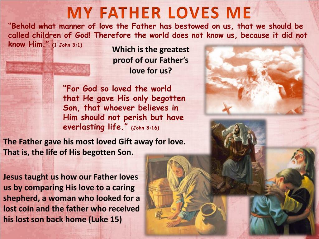 MY FATHER LOVES ME “Behold what manner of love the Father has bestowed on us, that we should be called children of God! Therefore the world does not know us, because it did not know Him.” (1 John 3:1) Which is the greatest proof of our Father’s love for us? “For God so loved the world that He gave His only begotten Son, that whoever believes in Him should not perish but have everlasting life.” (John 3:16) • The Father gave his most loved Gift away for love. That is, the life of His begotten Son. Jesus taught us how our Father loves us by comparing His love to a caring shepherd, a woman who looked for a lost coin and the father who received his lost son back home (Luke 15)