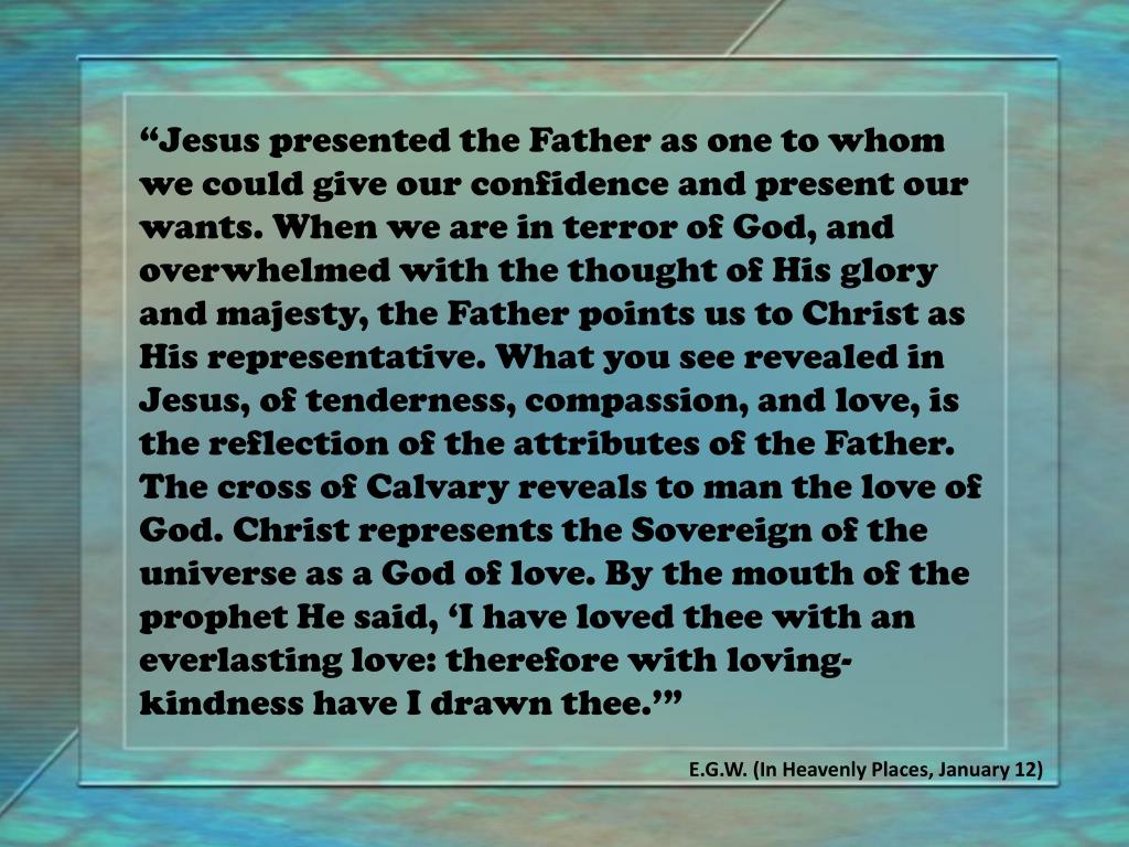 “Jesus presented the Father as one to whom we could give our confidence and present our wants. When we are in terror of God, and overwhelmed with the thought of His glory and majesty, the Father points us to Christ as His representative. What you see revealed in Jesus, of tenderness, compassion, and love, is the reflection of the attributes of the Father. The cross of Calvary reveals to man the love of God. Christ represents the Sovereign of the universe as a God of love. By the mouth of the prophet He said, ‘I have loved thee with an everlasting love: therefore with loving-kindness have I drawn thee.’” E.G.W. (In Heavenly Places, January 12)